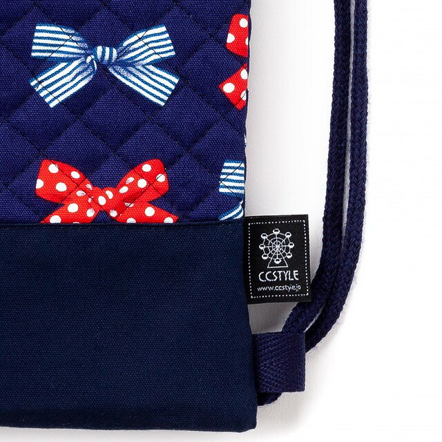 ナップサック キルティング ポルカドットとストライプのフレンチリボン(ネイビー) 子供用 ナップサック 巾着 体操着入れ 小学生 子供 キッズ お着替え袋 おしゃれ